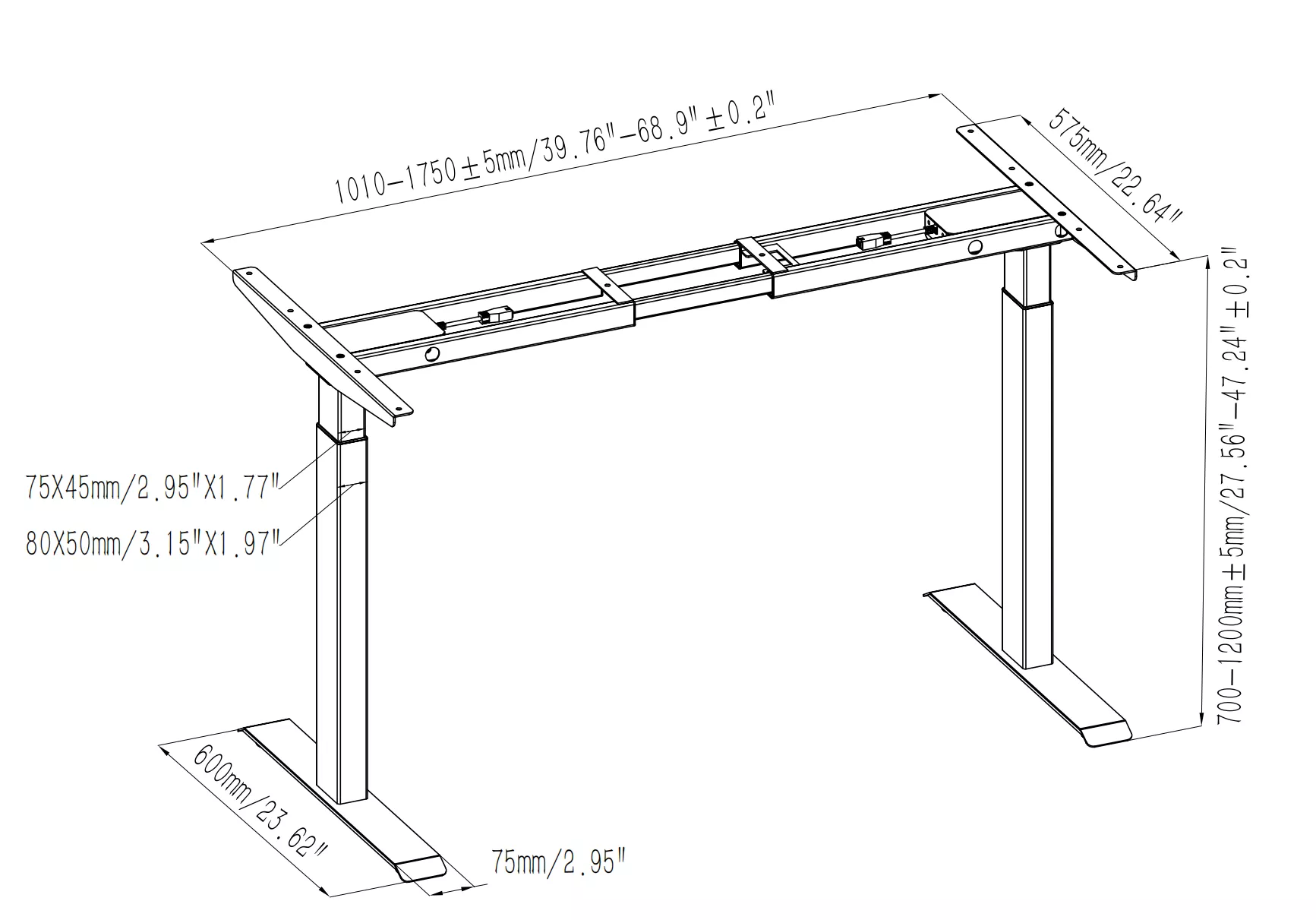 Motor Quantity:Dual Motor Motor Type:Brushed Motor Column Direction:Standard Column Column Segments:Two Stage Column Max Speed:30mm/s Type of Leg:Rectangular 2-stage Standard column Height Range:700-1200mm Frame Width:1010-1750mm Load Capacity:120kg Tabletop Size:1200-1800mm(Optional) Noise:<50dB Packing Size:1060x255x215mm Packing Weight:28.5kgs